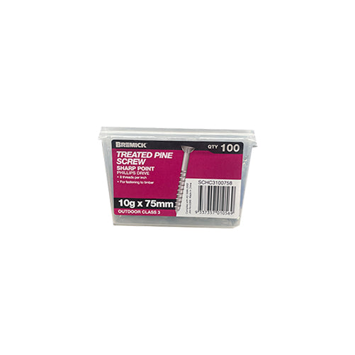 Bremick's range of screws and other materials covers domestic, commercial, and industrial needs with products varying in sizes. Each screw meets the highest standards of quality and has been designed to add value to any job. This screw is specifically designed for treated pines, and its galvanised property assures you secure fastening, and protection against rust for a long period of time. Its countersunk head allows for a perfectly tapered fastening job so you wouldn't have to worry about getting scraped by protruding screw heads.