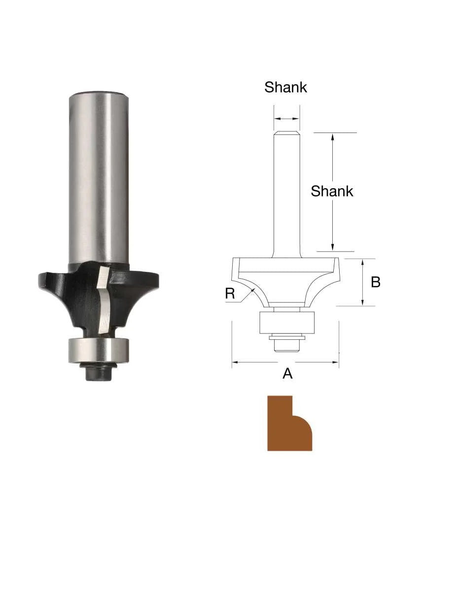 Rounding over bits are the most used of all the edge forming router bits. They are used for just breaking the sharp edge on a job as well as cutting decorative edging to form drop leaf joints.